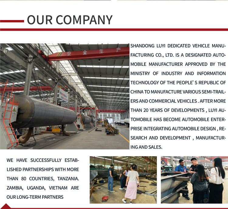 - Üzemünk:Shandong Luyi Vehicle Co., Ltd. a különböző pótkocsik minősített gyártói közé tartozik, mint például az alacsony alvázú félpótkocsik, platós pótkocsik, rakományos pótkocsik, csontvázas konténeres félpótkocsik, 50 láb platós pótkocsik stb. Magas színvonalú gépekkel és automata berendezésekkel, nagy teljesítményű K+F csapattal és elit értékesítési csapattal hosszú üzleti kapcsolatot építettünk ki számos világhírű vállalattal, mint például a SINOTRUK, SHACMAN stb.