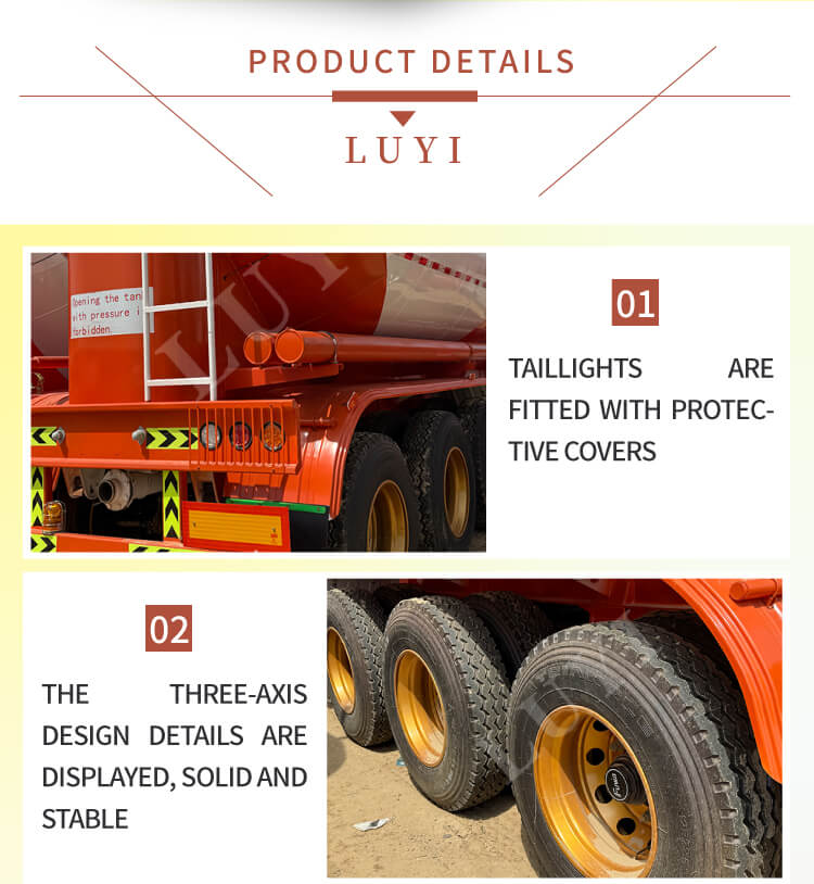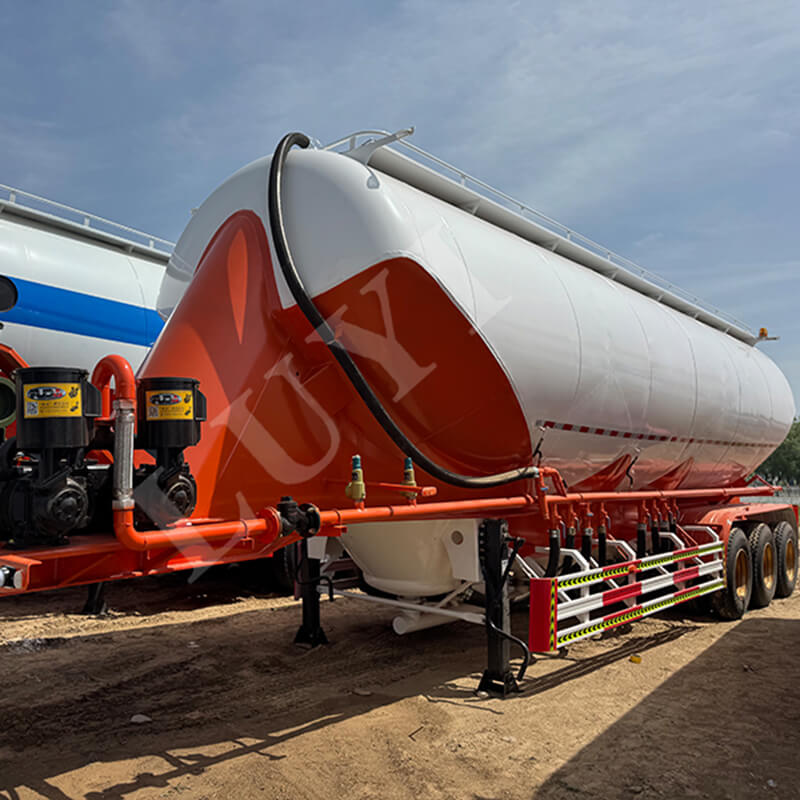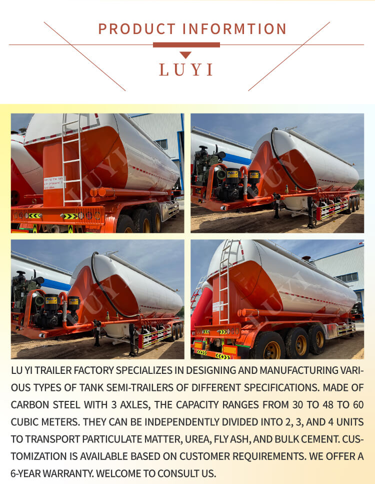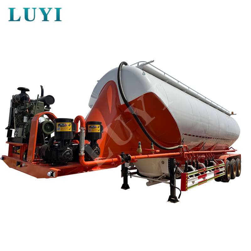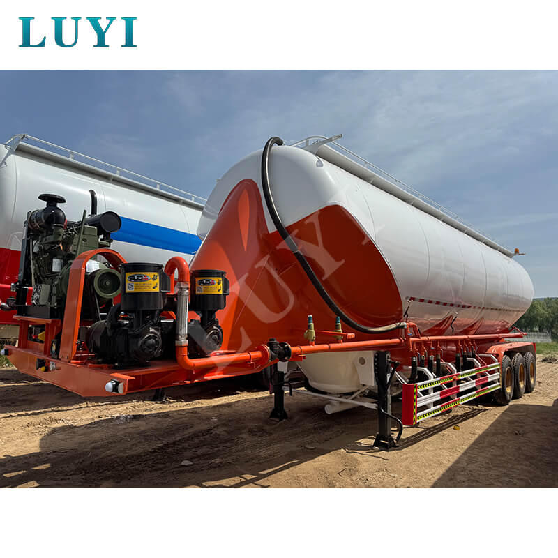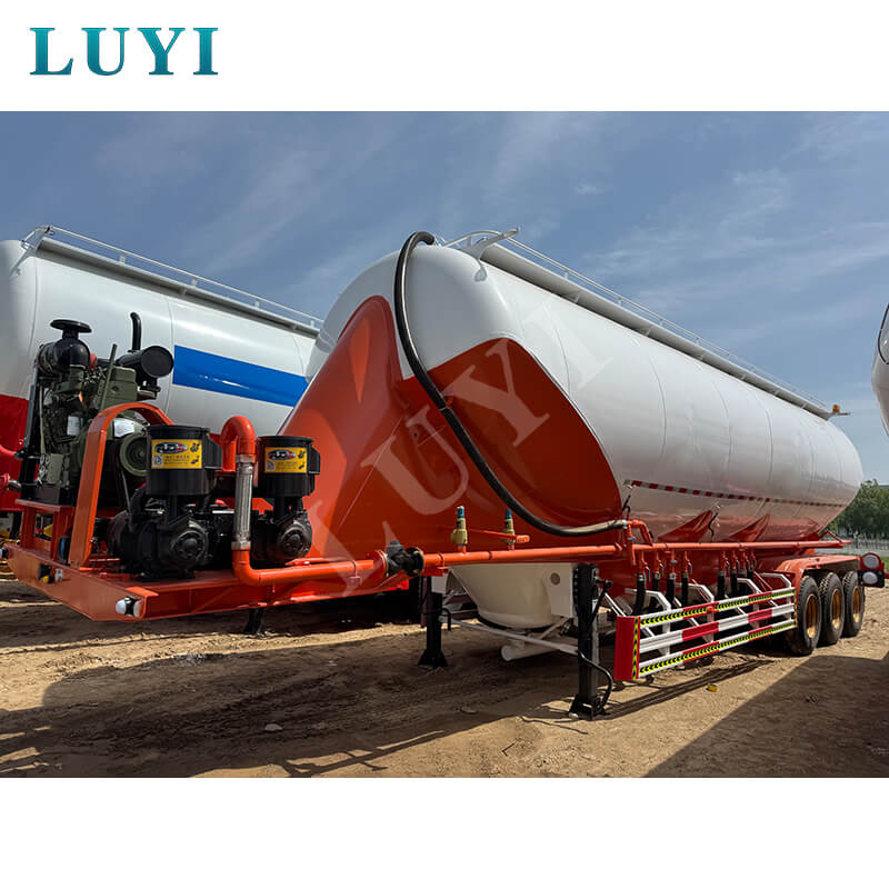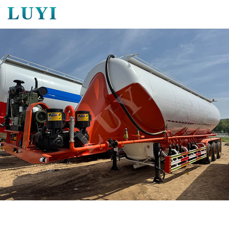 A kínai Shandong tartományból származó LUYI 3-tengelyes, 50 tonnás V-típusú cementszállító tartálykocsi félpótkocsi egy nagy hatékonyságú, kifejezetten ömlesztett cementpor-szállításra tervezett teherautó-félpótkocsi, más néven portartálykocsi, amely pontosan megfelel a rakományszállítási forgatókönyvek igényeinek.