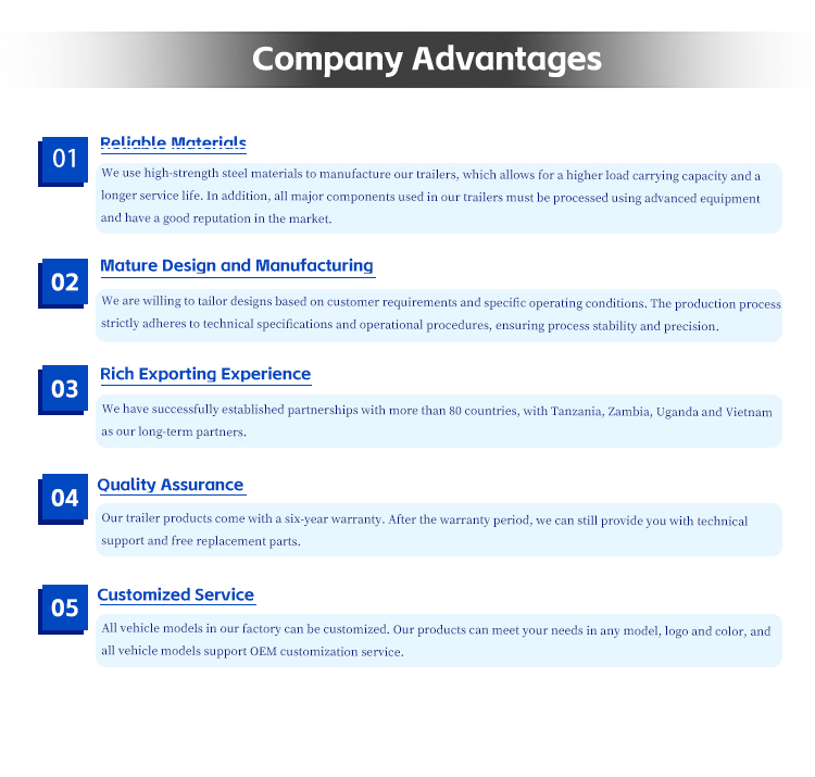 500 mm magas Q345 szénacél kerékagyakkal és 70 tonnás teherbírású megerősített főgerendákkal erős szerkezeti stabilitást és hosszú élettartamot biztosít. Opcionálisan 4/6 tengellyel, hozzáillő mechanikus rugós vagy légrugós rendszerrel, valamint többfunkciós gumiabroncsokkal, beleértve a 11.00R20, 12R20 és 315/80R22.5 méretű abroncsokat, folyamatosan fut különféle összetett útviszonyok között. A hidraulikus hengerrel hajtott U alakú billenőtest gyors és hatékony ürítést tesz lehetővé. A különféle vásárlói igények kielégítésére testreszabható szín áll rendelkezésre, így megbízható és tartós nehéz szállítóeszköz ömlesztett anyagokhoz, mint például homok, kavics és szén.