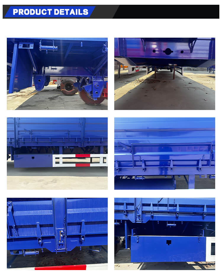A pótkocsi 12500×2500×1600 mm méretű, 3 tengellyel (egyenként 13 tonnás) és mechanikus felfüggesztési rendszerrel van felszerelve a sima vezetés és a megbízható teherbírás érdekében. A biztonságos be- és kirakodás érdekében szabványos 28 tonnás futóművel, valamint 12R22.5/12.00R20/11R22.5 specifikációjú abroncsokkal van felszerelve, hogy alkalmazkodjanak a különböző útviszonyokhoz. Ezen kívül a 90×13×10 mm-es laprugók növelik a teherbírást, a mechanikus létra az üzemeltetési kényelmet, a színek pedig igény szerint testreszabhatók, rugalmas és megbízható testreszabott megoldást biztosítva a logisztikára és a szállításra.