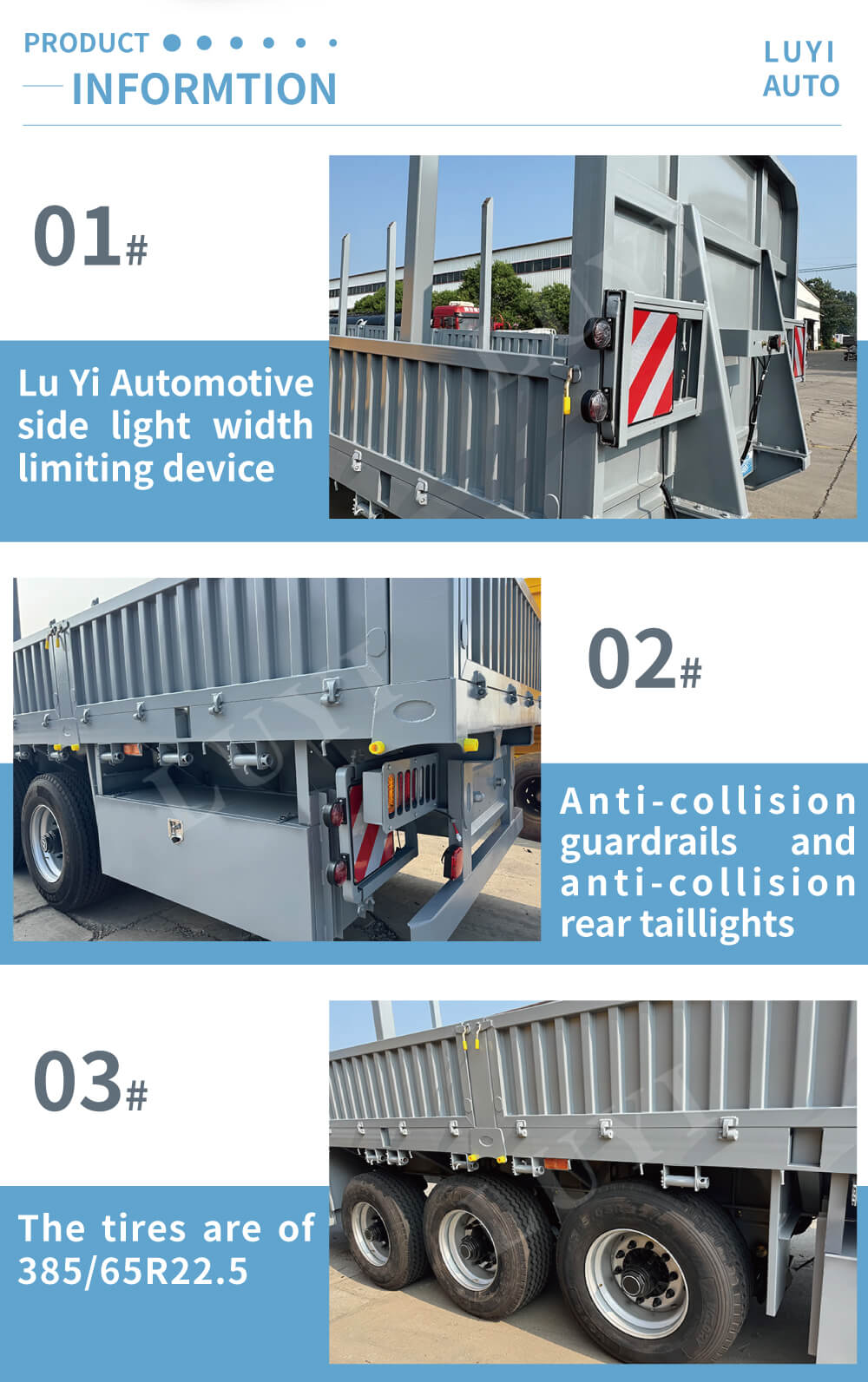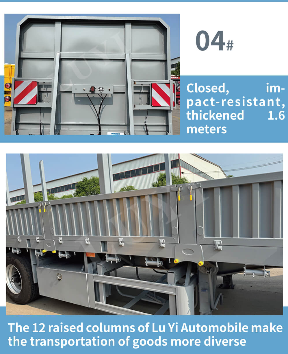 A kínai Shandongban található LUYI 3 tengelyes, oszlopos oldalfalú félpótkocsi optimális választás ömlesztett rakományok és konténerek szállítására. Kiváló minőségű acélból készült, precíz 12500x2500x1600mm-es méretekkel és 60 tonnás maximális teherbírással rendelkezik, melynek nagy teherbírása könnyedén kielégíti a különféle nagy teherbírású szállítási igényeket.
