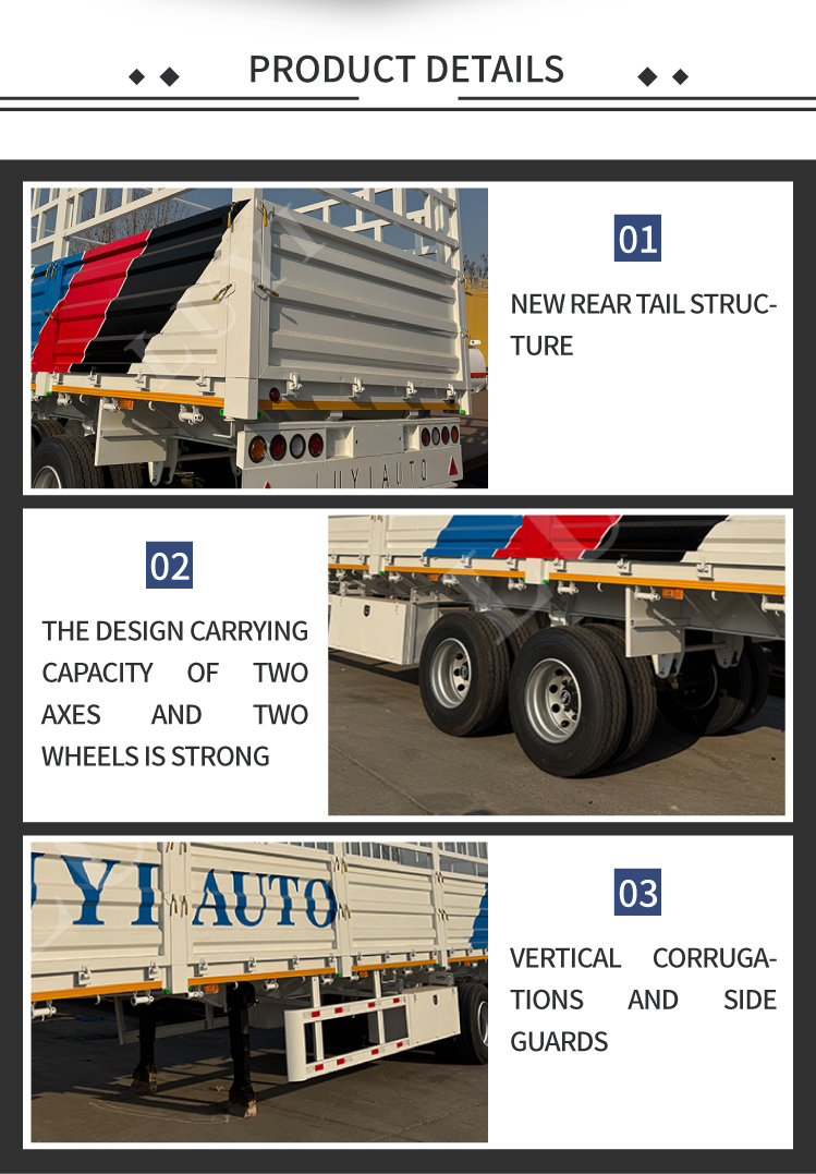 A LUYI újonnan tervezett 2 tengelyes, magas kerítésű oldalfalú félpótkocsija kettős, 30 és 60 tonnás teherbírást kínál, tökéletesen kielégítve a közepes és nehéz teherszállítási igényeket, mint például az építőanyagok, ipari berendezések és mezőgazdasági termékek. A magas kerítésszerkezet hatékonyan megakadályozza a rakomány kiömlését szállítás közben, míg a testreszabható funkciók lehetővé teszik a kerítés magasságának, a kocsi anyagoknak és a csúszásgátló padlónak a pontos igényeinek megfelelő beállítását. Ez a sokoldalú, személyre szabott pótkocsi már megvásárolható, ideális logisztikai cégek és szállítmányozók számára egyaránt.