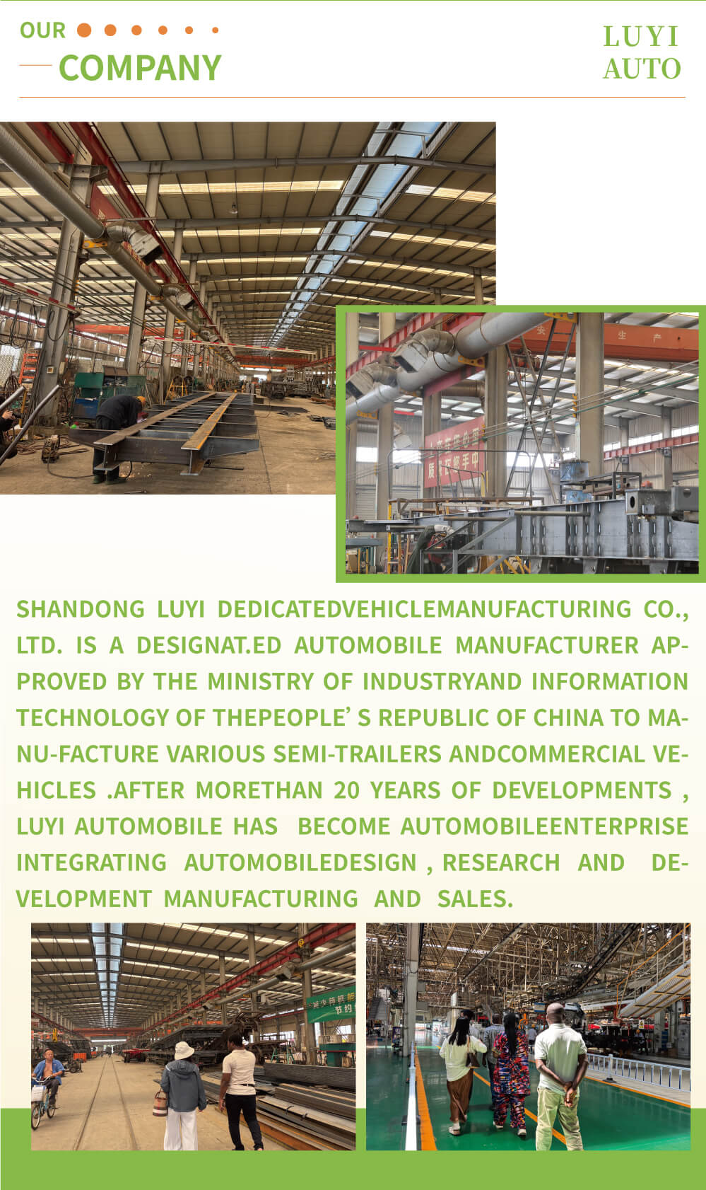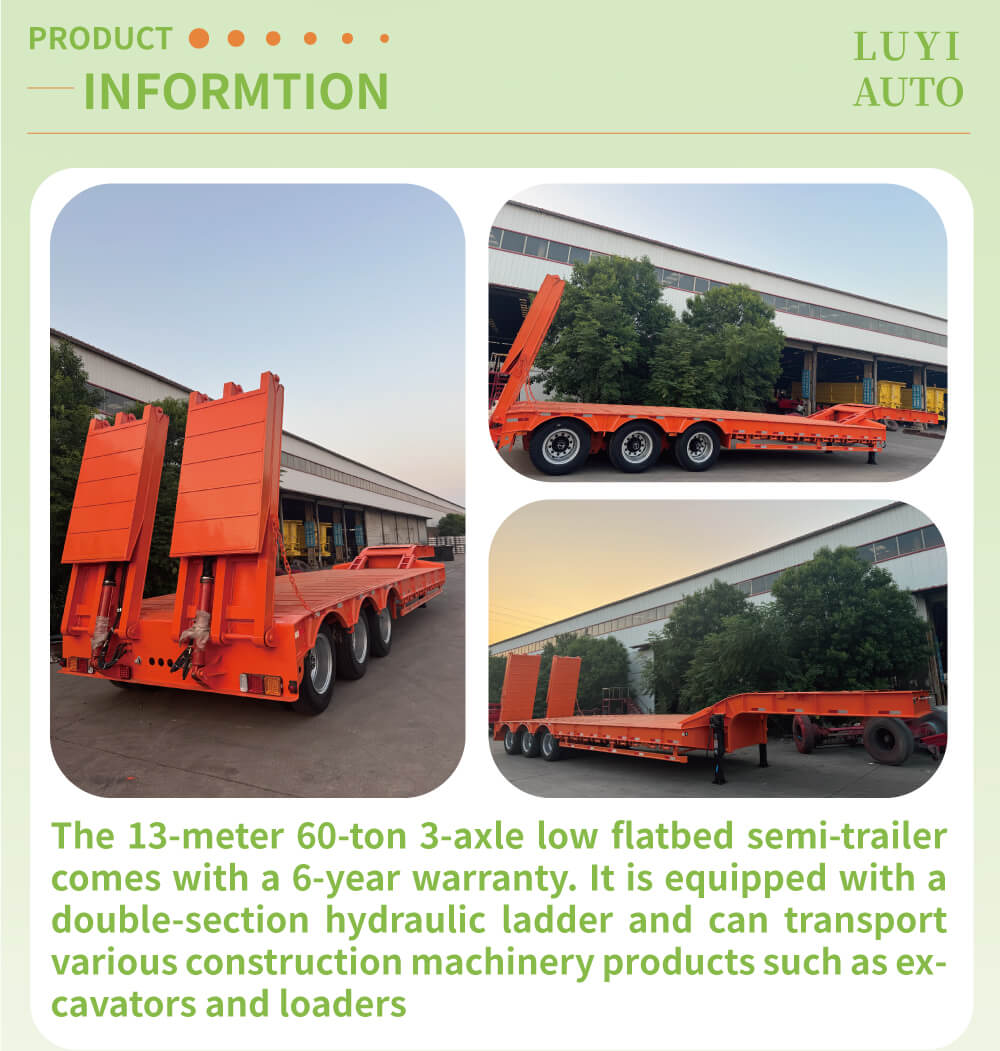 A LUYI 3 tengelyes, 60 tonnás levehető hattyúnyakú, alacsony ágyású félpótkocsi, amelyet Shandongban, Kínában gyártanak, egy professzionális teherszállító pótkocsi. Teste nagy szilárdságú acélból készült, mérete 1700030001500mm. A szerkezet masszív és elegendő a hely, amely lehetővé teszi a nehéz rakományok stabil rakodását és alkalmazkodik a különféle teherautó vontatási műveletekhez