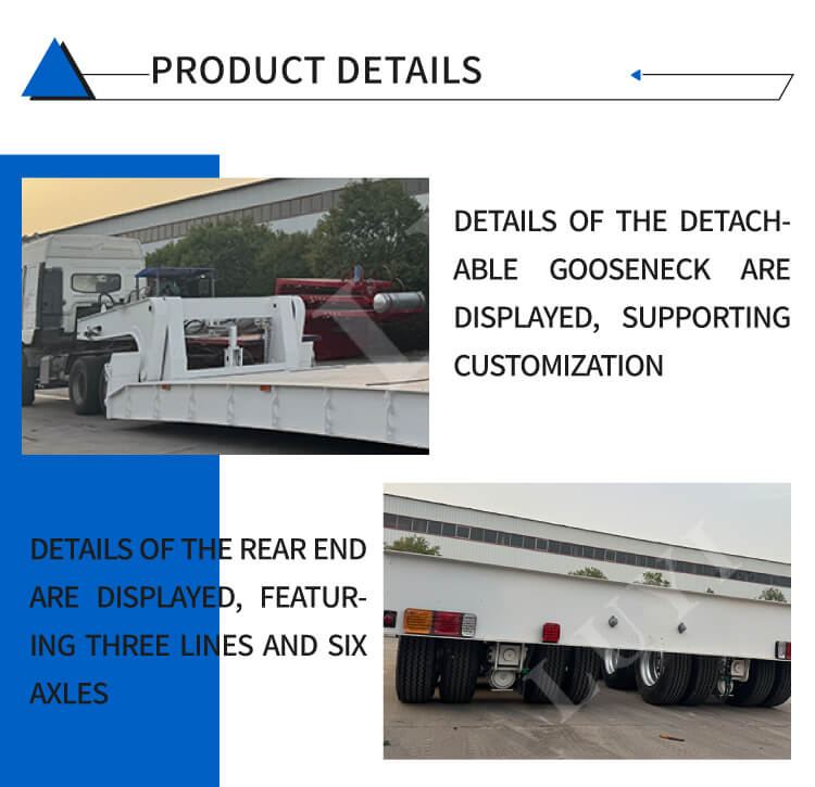 Ami a részleteket illeti, szabványos 28 tonnás futóművel van felszerelve, és kétféle JOST királycsapot kínál: 2" (50 mm) vagy 3,5" (90 mm) a különböző traktorokhoz való alkalmazkodás érdekében. A karosszéria színét az ügyfelek személyre szabhatják, az összecsukható hattyúnyak kialakítás pedig tovább növeli a szállítási rugalmasságot. Ideális választás nagy teherbírású berendezések átviteléhez mérnöki, bányászati és egyéb területeken.